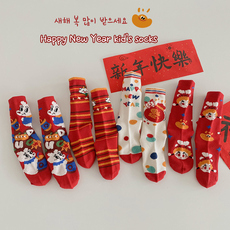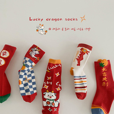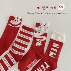 儿童袜子冬季新年袜纯棉中筒无骨卡通男女童宝宝过年袜龙年本命年